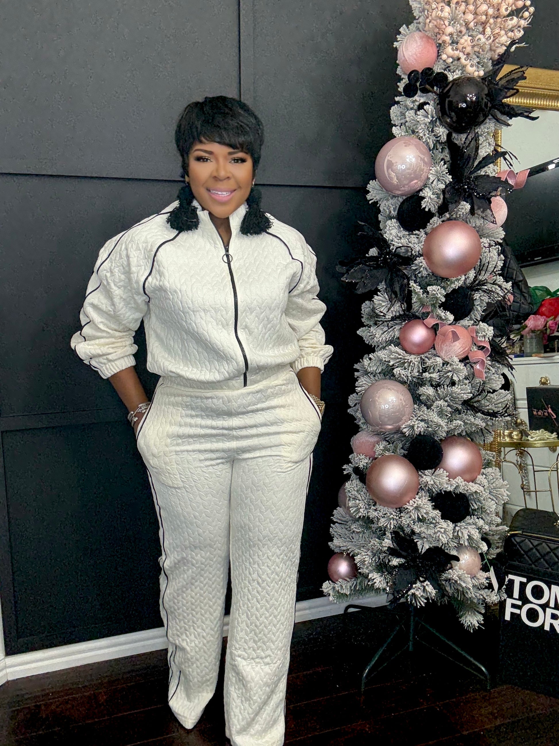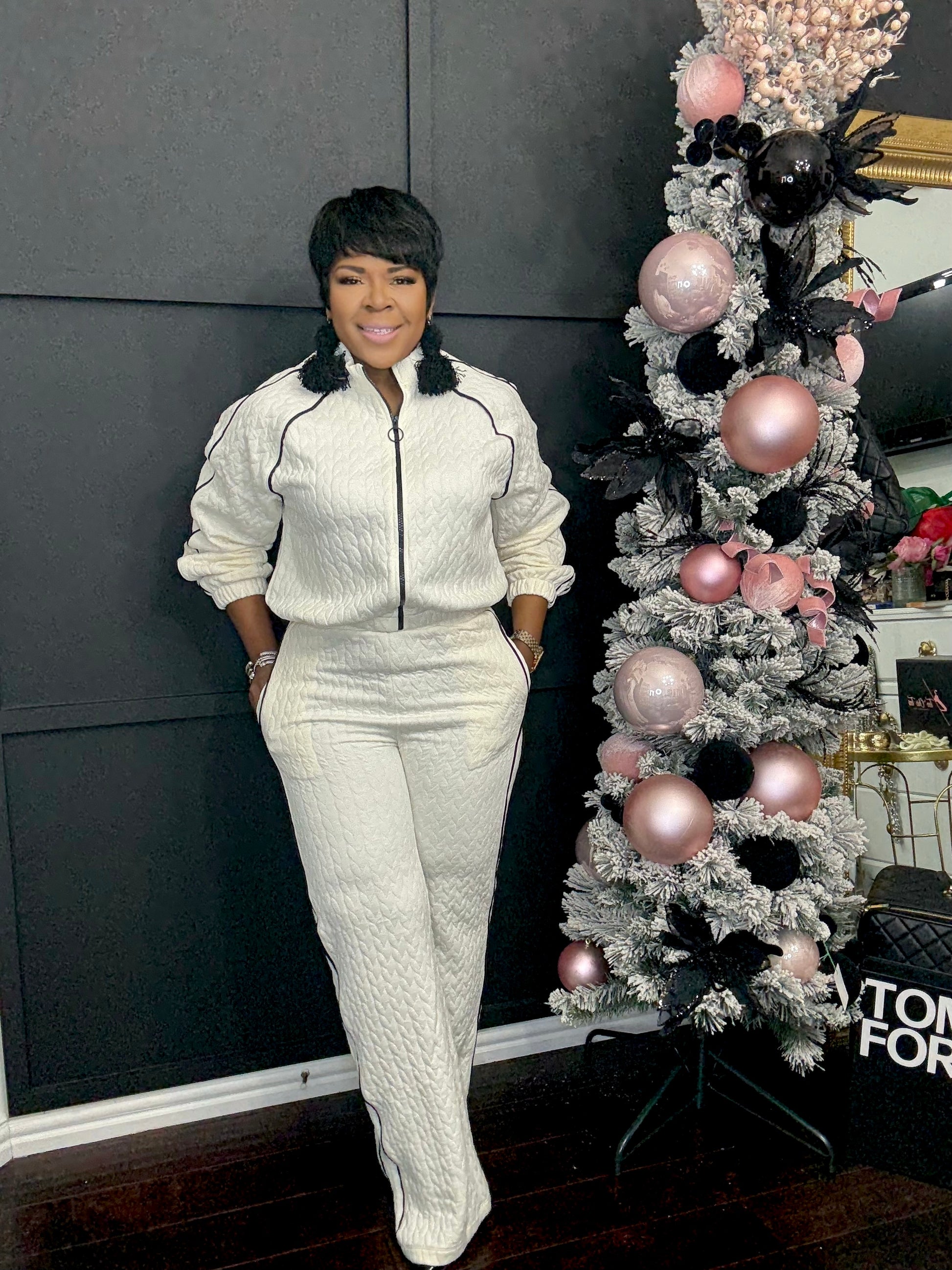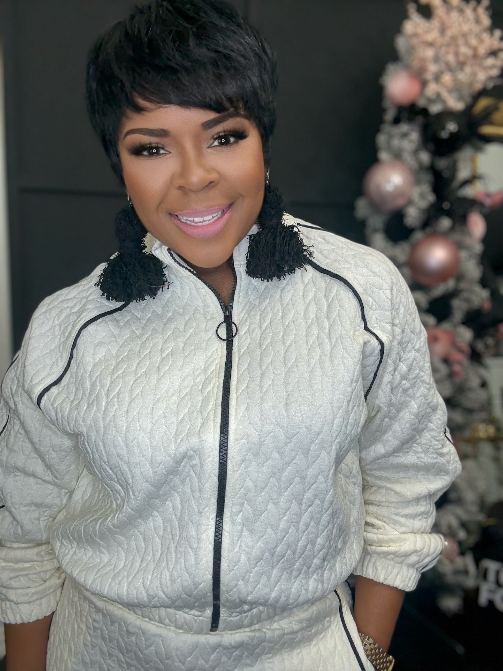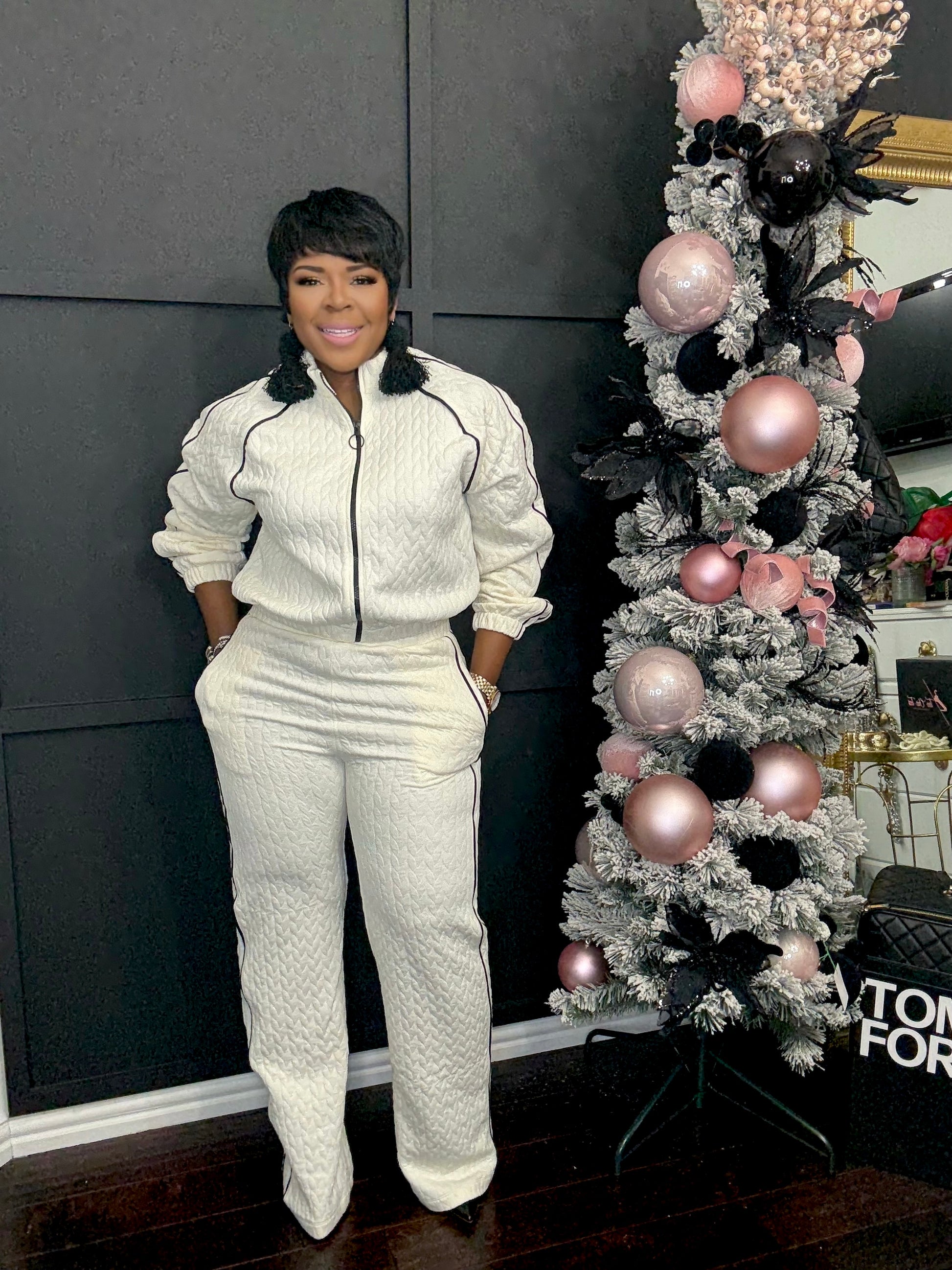 The Creme De La Creme Set exudes elegance with its cream color trimmed in black. This beautiful tracksuit is perfect for any occasion, providing both comfort and style. Its classy design and practical pockets make it a must-have for those who appreciate luxury and sophistication.y