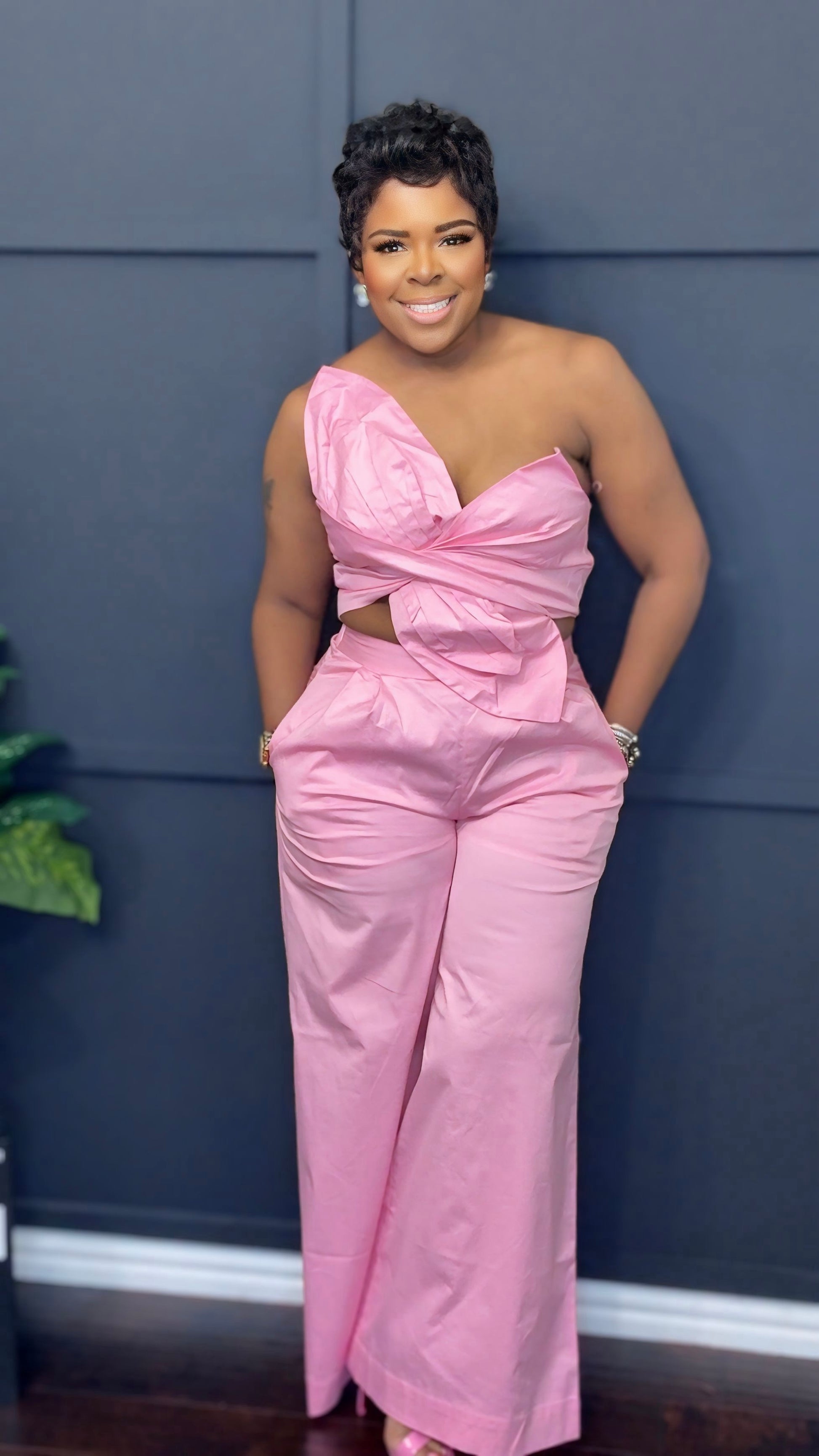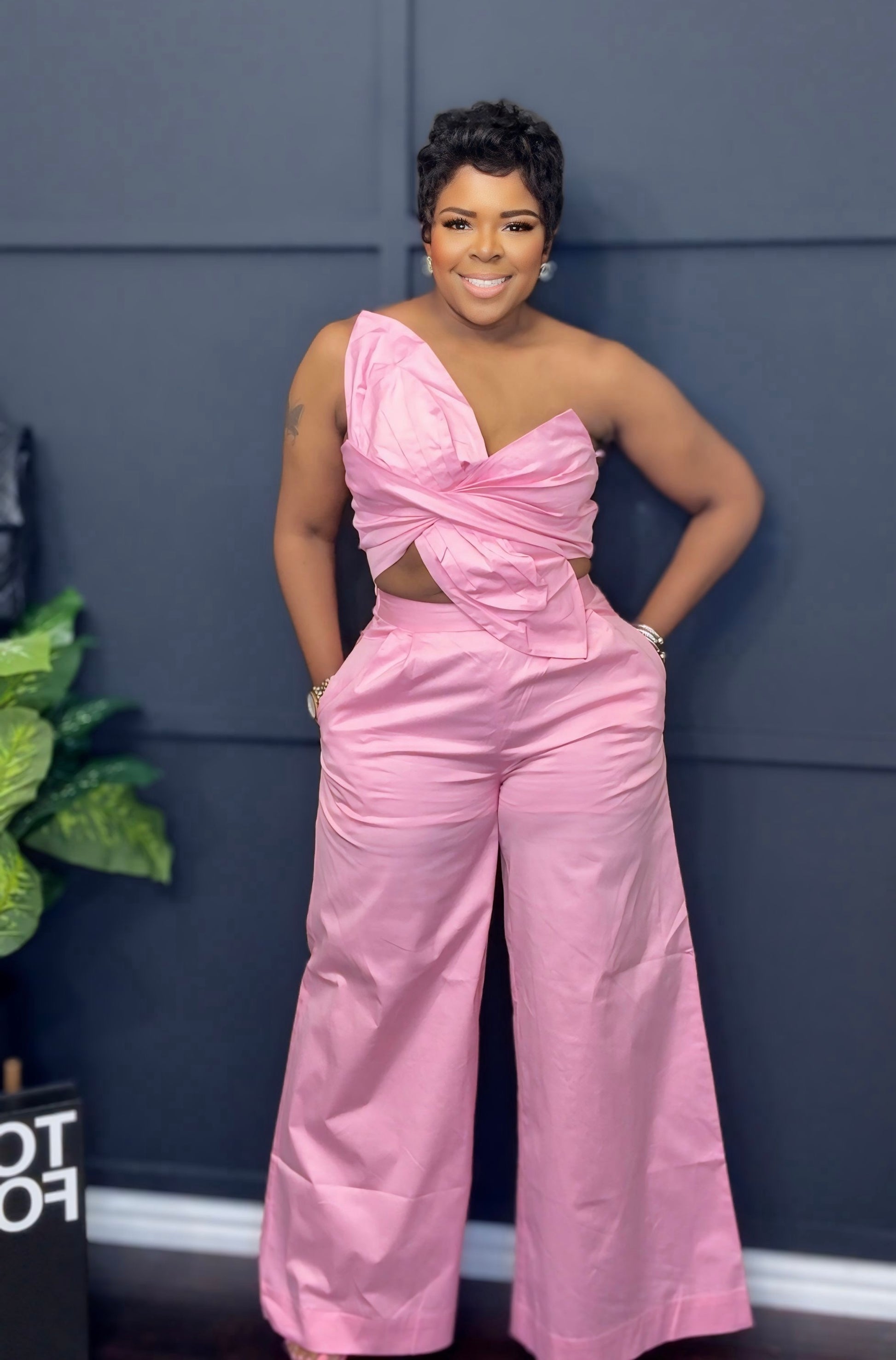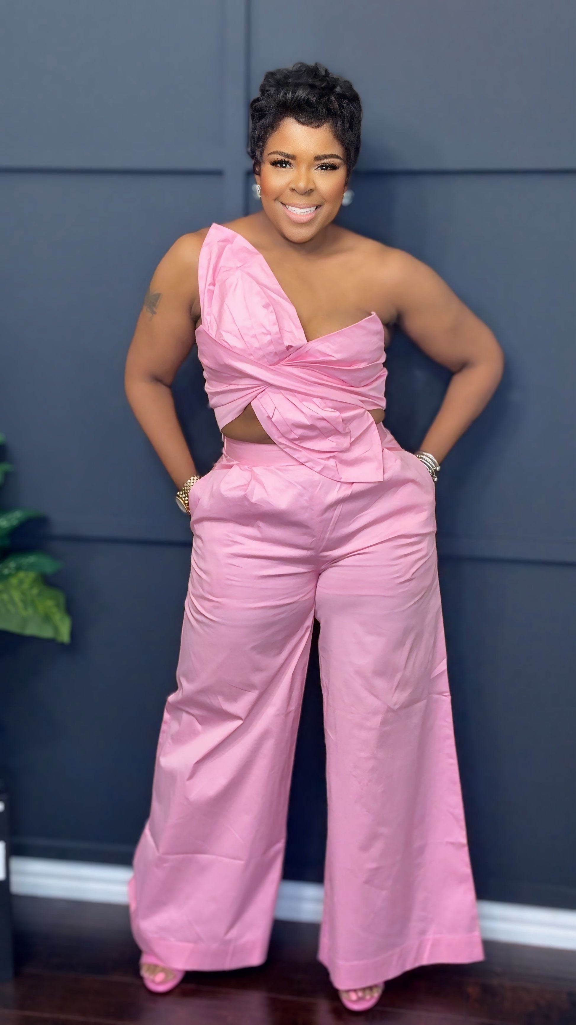 Elevate your wardrobe with the Get Twisted Set, an exquisite ensemble featuring wide-leg pants adorned with a mesmerizing floral top. The gentle stretch enhances comfort, while the addition of pockets seamlessly marries practicality with elegance. This luxurious attire invites you to indulge in sophistication, embodying a harmonious blend of artful design and refined functionality.