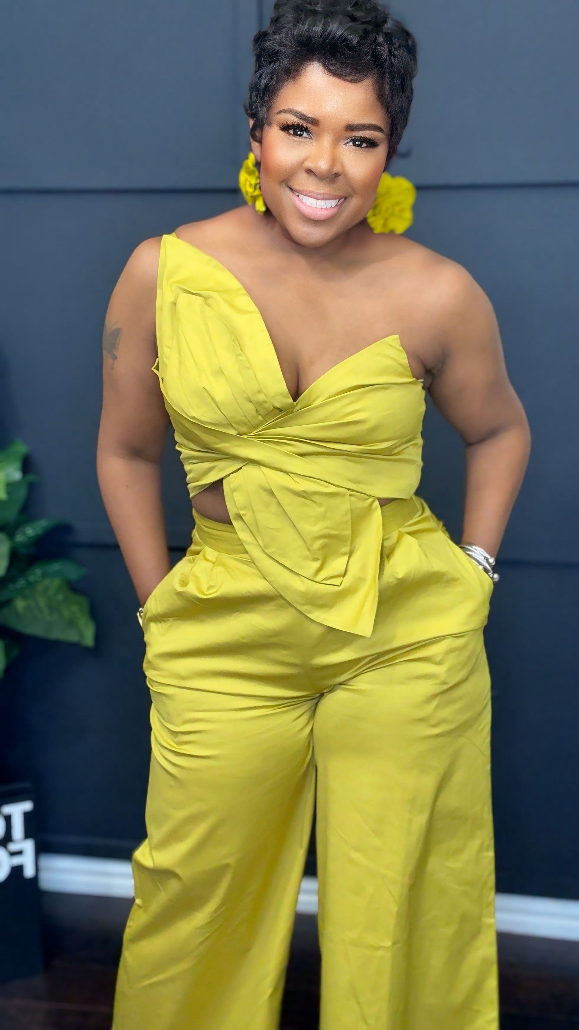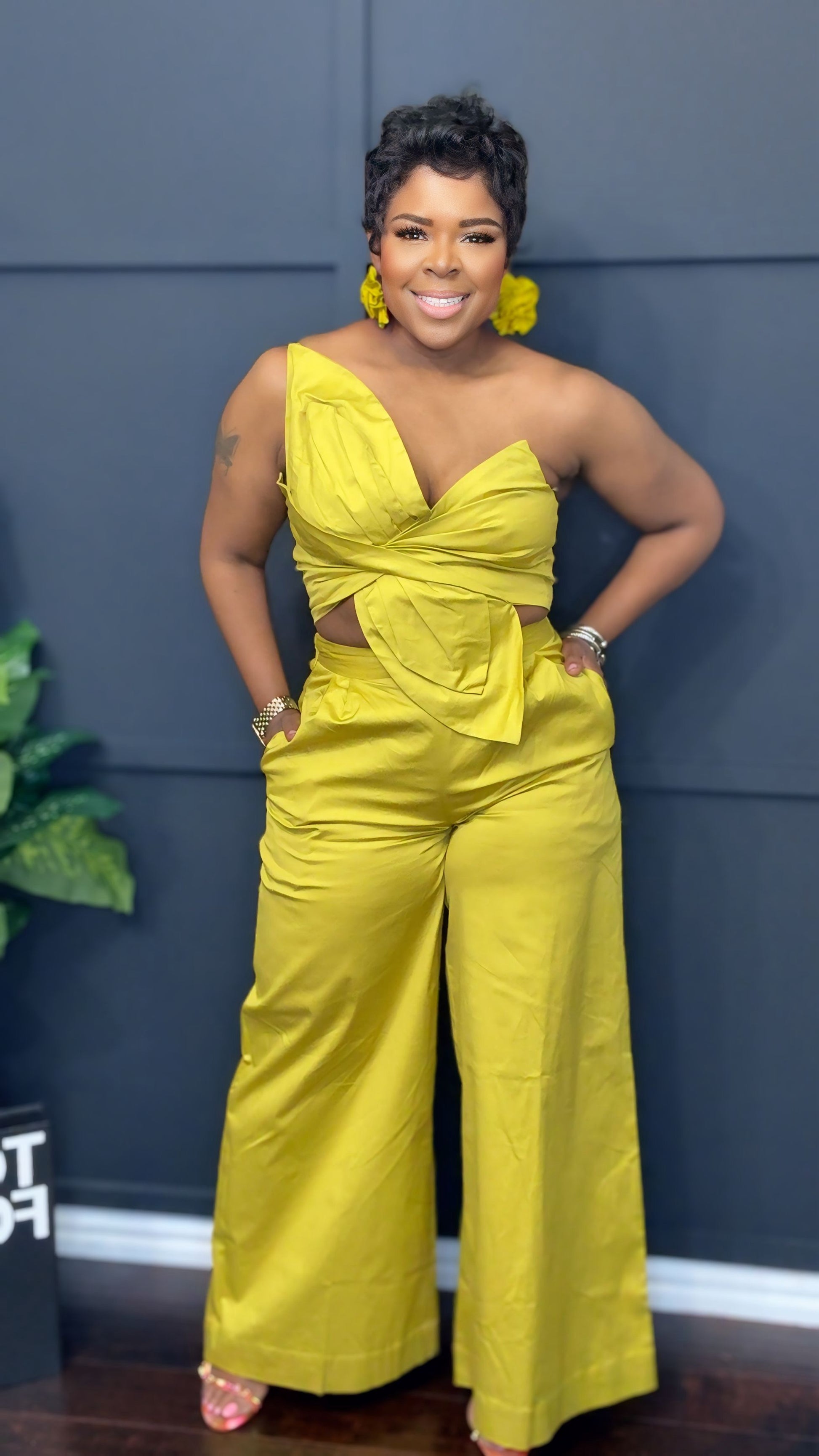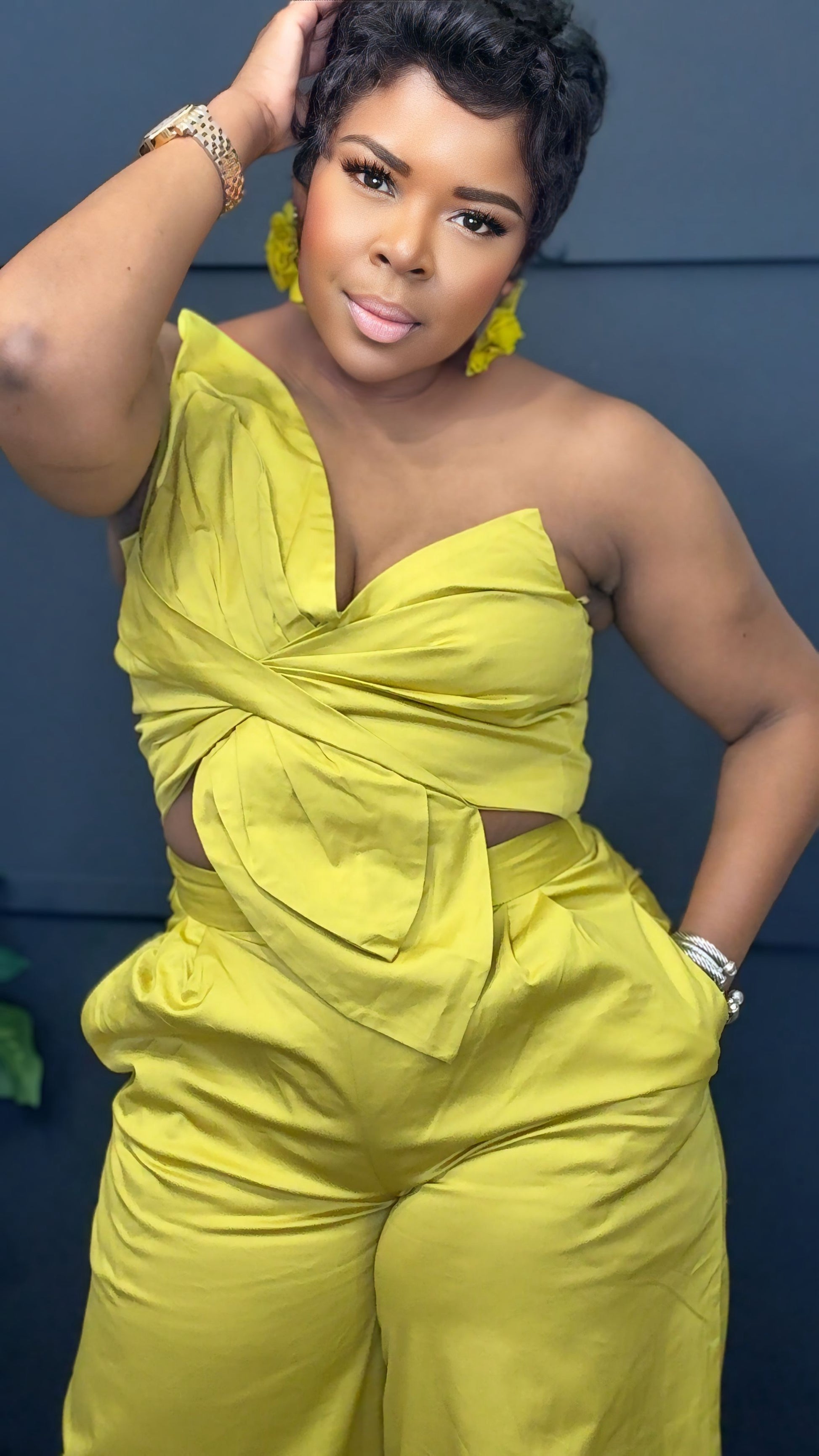 Elevate your wardrobe with the Get Twisted Set, an exquisite ensemble featuring wide-leg pants adorned with a mesmerizing floral top. The gentle stretch enhances comfort, while the addition of pockets seamlessly marries practicality with elegance. This luxurious attire invites you to indulge in sophistication, embodying a harmonious blend of artful design and refined functionality.