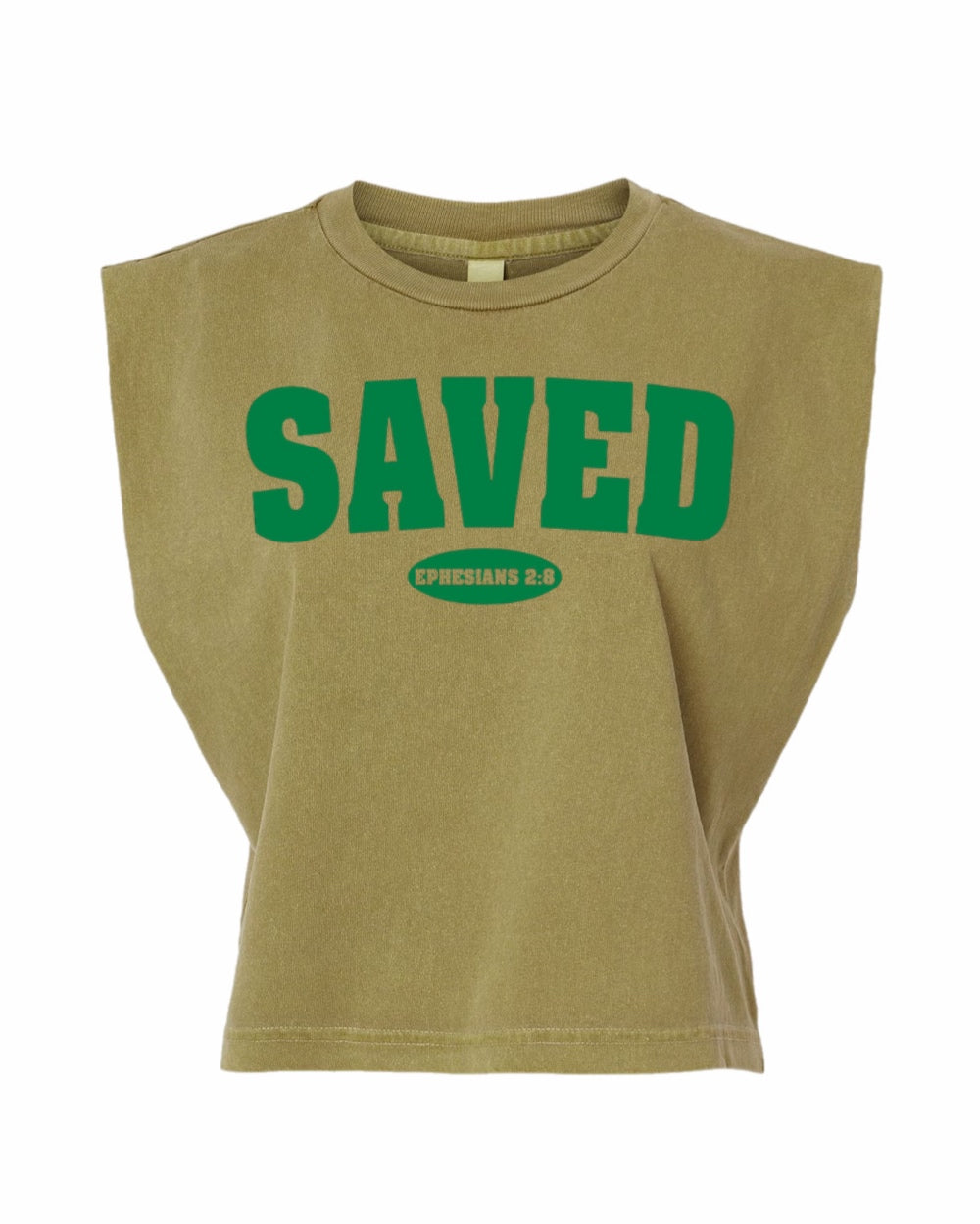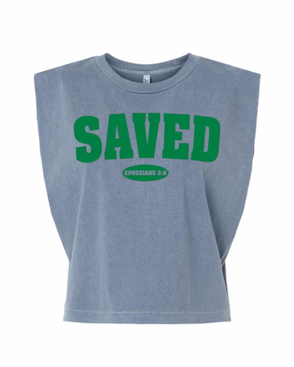 Introducing the Saved Muscle Tank Tee from our exclusive I Am Collection. This cropped muscle tank combines comfort with confidence, featuring a flattering silhouette perfect for layering or wearing solo. Crafted for everyday wear, it's an essential addition to any wardrobe. Celebrate self-affirmation with style—because you are enough.
